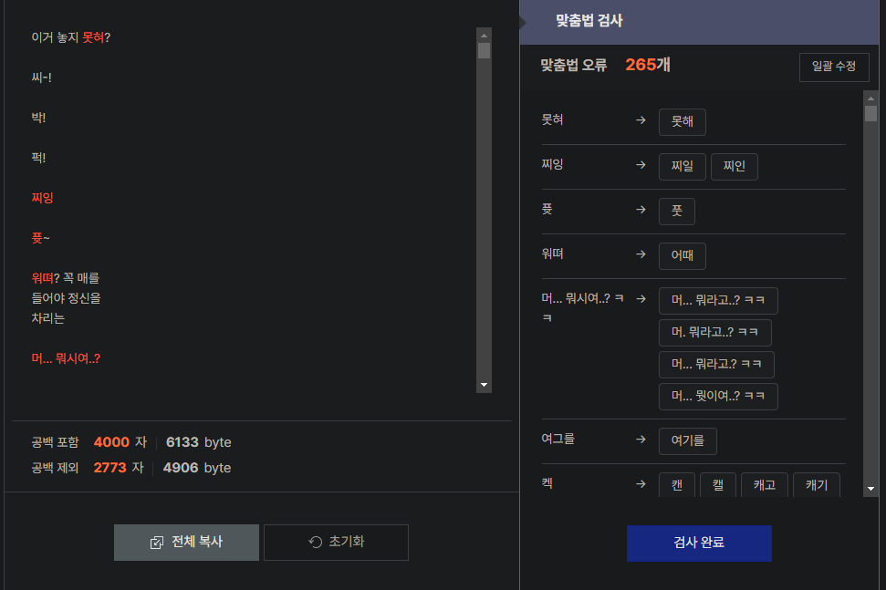 7. 왼칸에 복사한것 붙이고, 검사시작 버튼 클릭하고, 결과 나오면 오른족의 글자 버튼들을 눌러가며 수정하면 됨.