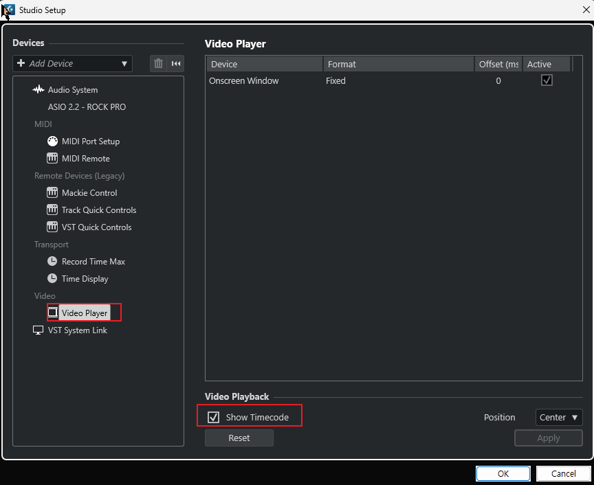 Studio Setup 으로 들어가서 Video player -> Show timecode를 체크 하면 된다.