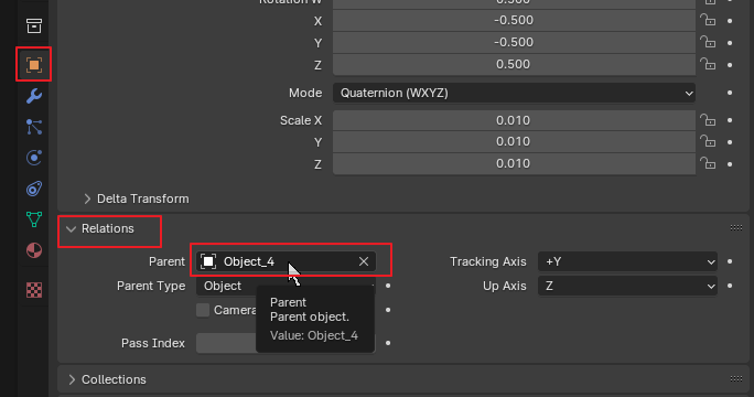 - Object Properties 탭: 우측 하단 속성창에서 주황색 사각형 아이콘(Object Properties) 클릭 후 Relations 항목을 보세요. Parent 칸에 부모의 이름이 적혀 있습니다.