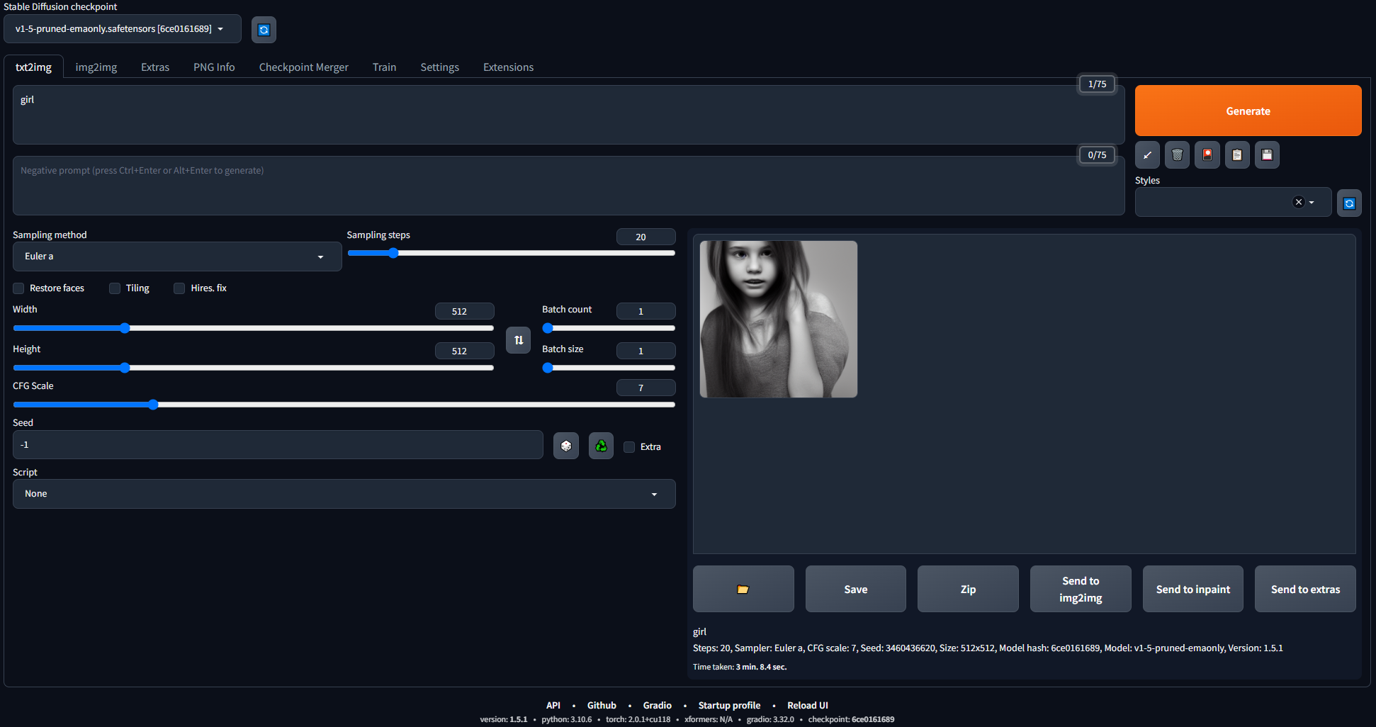 Prompt 창에 간단히 girl 이라고 명령 내려서 오른쪽 Generate 실행해 봅니다.
