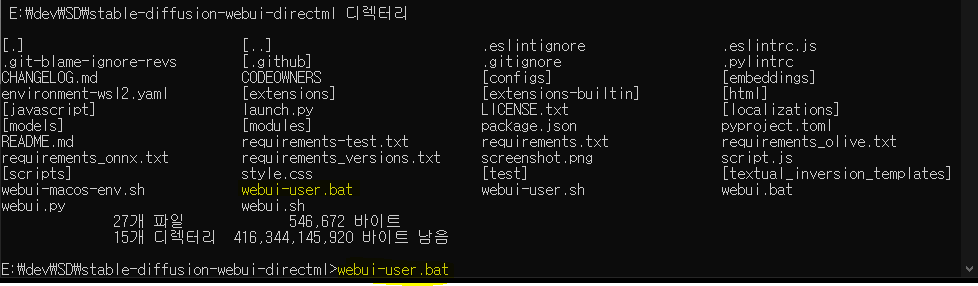 폴더가 생성 되었을 겁니다. 그 안의 webui-user.bat을 실행해주세요.