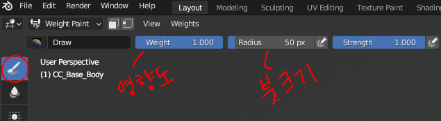 Radius 붓의 크기를 원하는 크리로 맞춘후