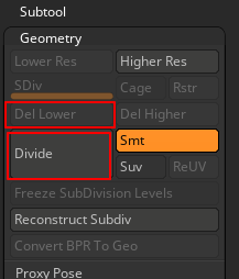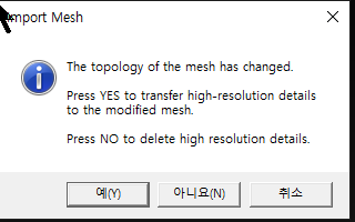 3. 지브러쉬에서 divide 를 올려서 블렌더로 가져오면 하이폴리 할수 있다.