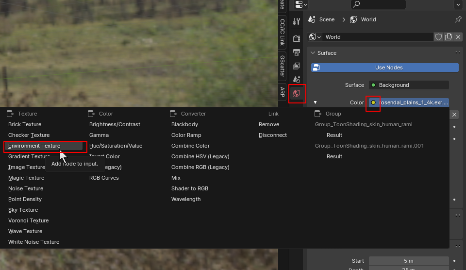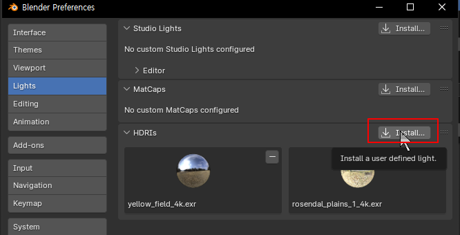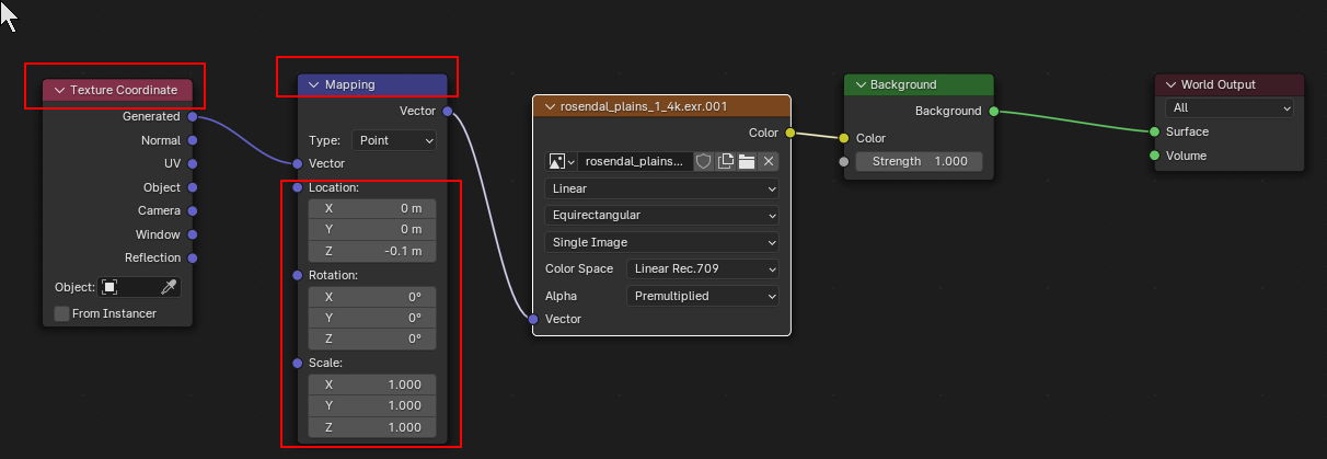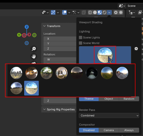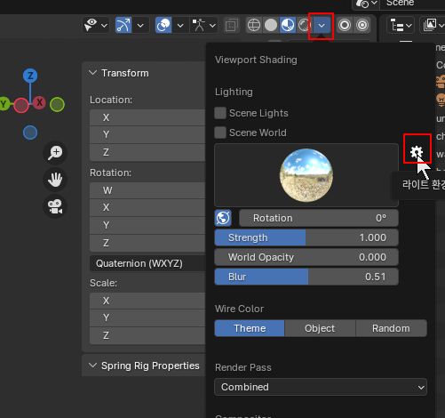 부분에 빨간 상자로 표시한 부분을 값을 바꾸면 HDRI 의 값을 조절할 수 있다.